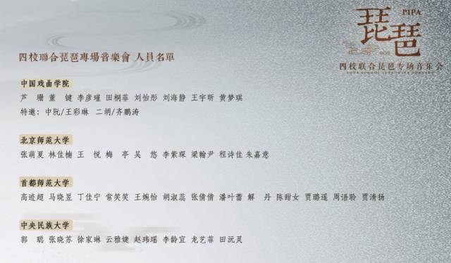 “‘琵琶四校联合音乐会’在中国戏曲学院音乐系的支持下,由青年演奏家梁宁老师担任策划,以琵琶室内乐作品为主要形式,为综合高校琵琶专业的学生们搭建了一个温暖、开阔、共同进步的舞台。