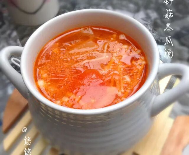 1. 材料洗净后,冬瓜去皮、去籽,切片;番茄去皮切块;金针菇去根。