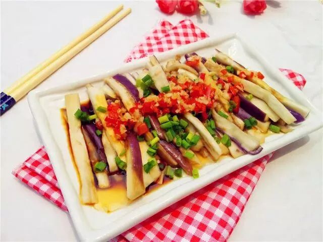 7. 茄子上撒葱花,再将红椒、大蒜碎和油均匀地淋在茄子上,拌匀即可食用~