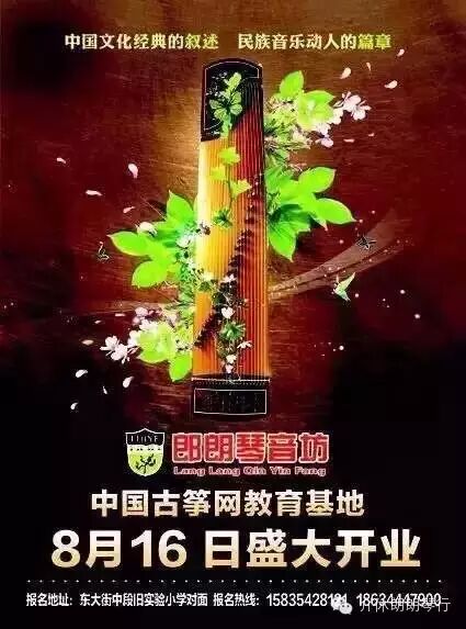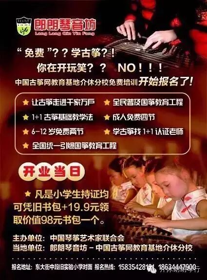 郎朗琴音坊为提升古筝教育培训的专业技能,为孩子能够更加轻松的学习并快速掌握古筝弹奏技巧,特加盟中国古筝网教育培训基地!特订于8月16日正式开业,凡在开业当天到场的各位家长朋友,均可享受免费试课,报名还可以享受到截止年底的免费成人四节古筝课和两节儿童古筝课,活动当天还有以旧换新书包的活动,孩子们可以拿自己的旧书包加19.9元换一个新书包!优惠多多,希望家长朋友和小朋友可以参与到我们的活动和学习中,我们也将用最专业的技能和最真诚的服务让您在古筝的学习中收获成果和快乐!咨询热线侯老师 15835428121 李老师 18634447900郎朗艺术中心成立于2013年,本艺术中心是一所集各种品牌乐器,钢琴,古筝,萨克斯,单簧管,二胡,吉他,笛子等乐器批发兼零售的聚集地,“信誉第一,质量第一”的理念让进店的贵客来的舒心,走的放心。
