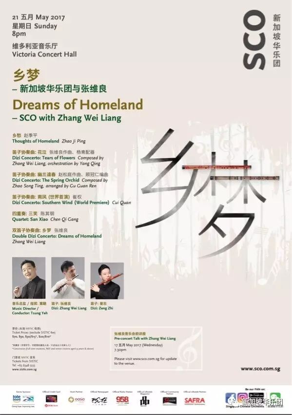 2017年5月21日,有着“圣手箫王”美誉的张维良大师将与新加坡华乐团再度合作,奉献一场以《乡梦》为主题的音乐会。张维良大师生于充满人文气息的苏州,他对这片土地怀有深刻感情。音乐会点题作双笛子协奏曲《乡梦》就是为此而写,将由张维良携亲传弟子曾志共同演绎。张维良对恩师赵松庭的深切怀念,则灌注在笛乐经典《幽兰逢春》里面。音乐会也将以四重奏的形式呈献陈其钢的名作《三笑》。
