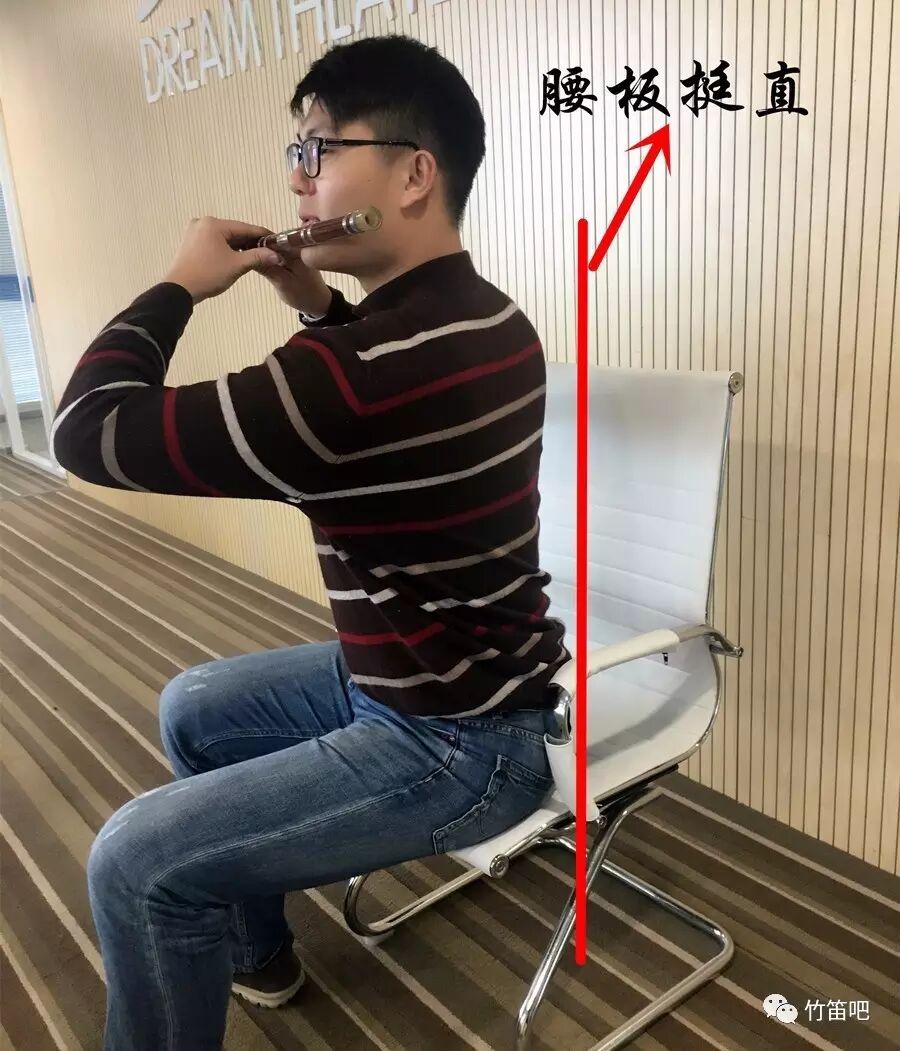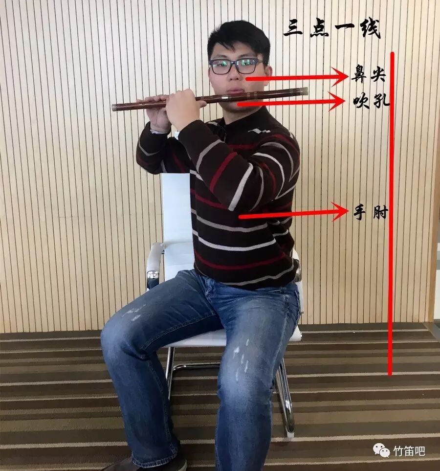 坐姿,我们坐着吹笛子的时候腰必须保持要直不能弯,双腿微微分开上身轻微向右转保持三点一线(鼻尖、笛孔、左手肘)同时也微微向前倾。