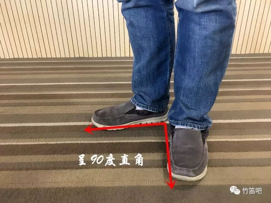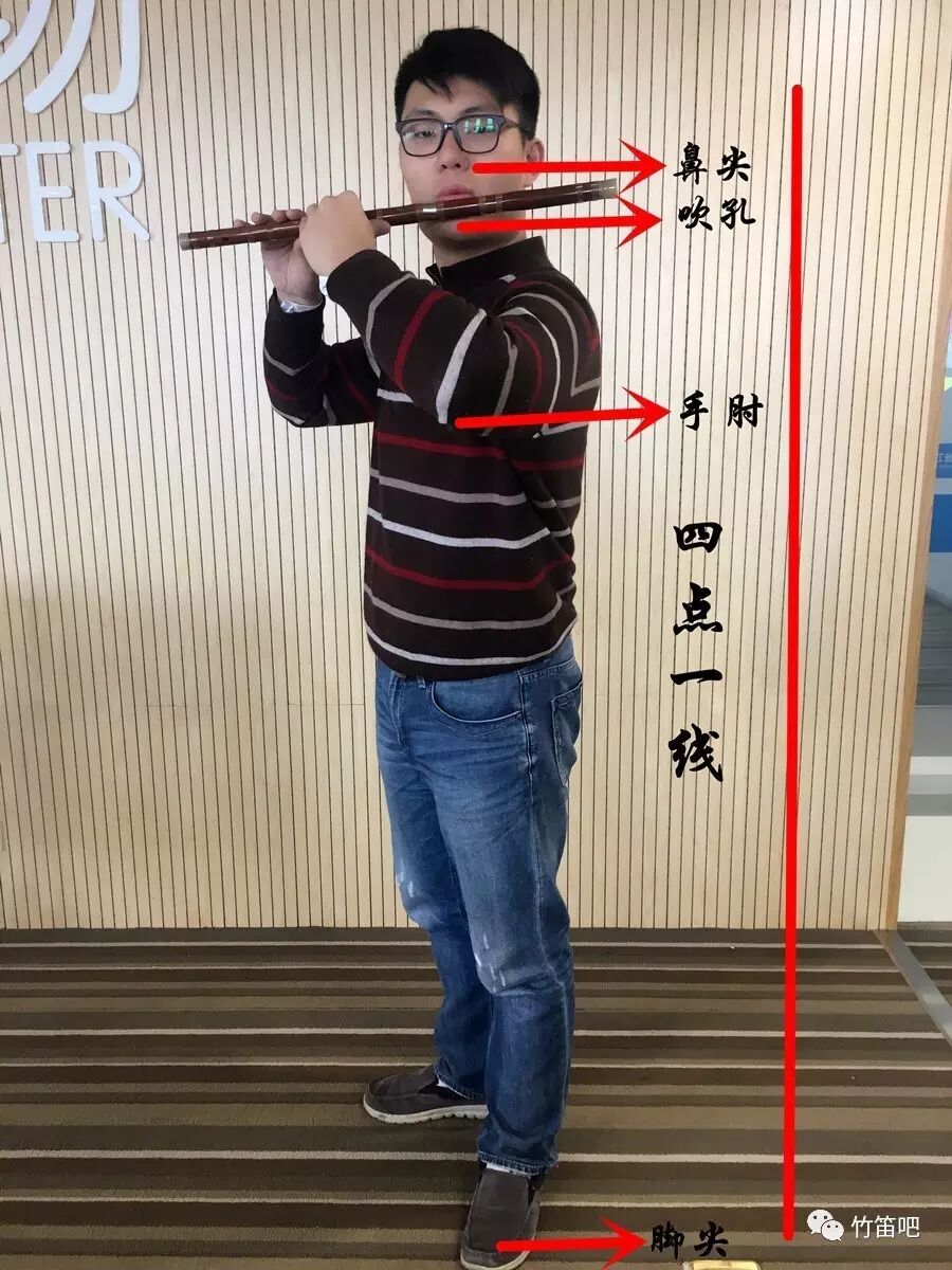 首先,我们来讲一下站姿,两脚呈现类似90°的形状,左手的手肘和左脚尖保持同一水平线,保持四点一线(鼻尖、笛孔、左手肘、脚尖)在同一水平线,人的上身向右微微的转,使自身保持一个松弛的状态,人轻微的往前倾。