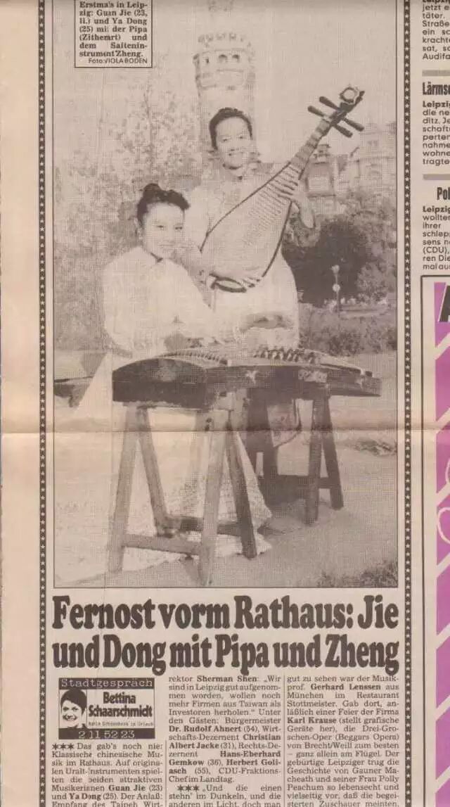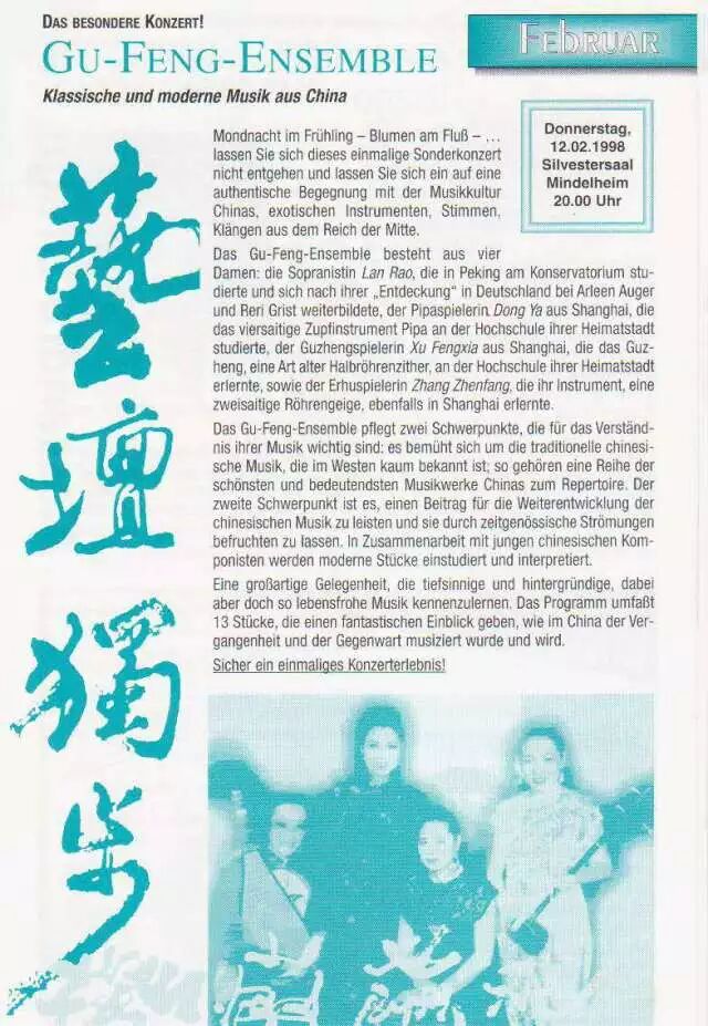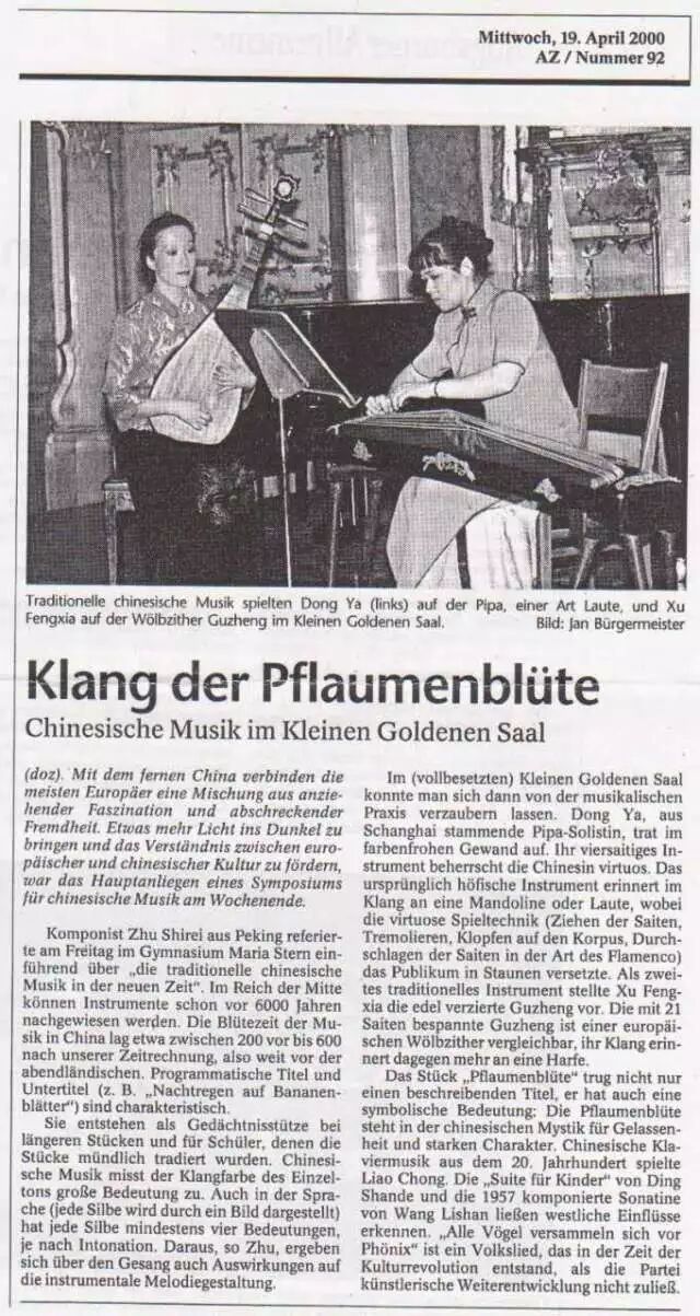 六月十九日德国古风乐团二位中国音乐名家:琵琶演奏家董亚,古筝演奏家徐凤霞受中国驻德国孔子学院委托作为中国音乐使者登上德累斯登歌剧院金色大厅(Semperoper Dresden),演奏中国传统音乐精典名作 “春江花月夜”。董亚与徐凤霞,二位驰骋欧洲乐坛近三十年的中国民乐老将,均毕业于中国第一所音乐学府上海音乐学院民族音乐系,师从叶绪然和李乙先生,毕业后董亚女士留校任职于母校,徐凤霞女士就职于上海民族乐团。二位演奏家上世纪八,九十年代先后侨居德国,作为自由职业演奏家,创立和参建了德国“古风乐团”,集当时寥寥数位顶尖国家民乐人才,开启了中国民乐人走向世界舞台,并立足于西方音乐界的漫漫长旅……