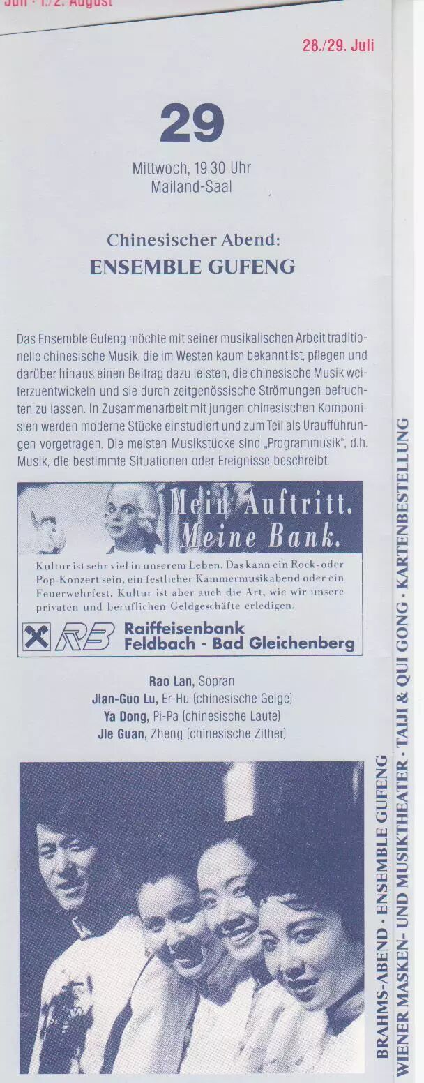 作为特邀演员古风乐团还赢得了笙独奏家吴巍,扬琴独奏家付人常,笛子独奏家缪宜民,古筝演奏家姚安,女中音演唱家李怡萍,青年女高音演唱家龚丽妮,翟鹏等的精诚合作。古风乐团GU-FENG Ensemble在德国及欧洲其它国家举行了大量的音乐会及与交响乐团合作的音乐会。