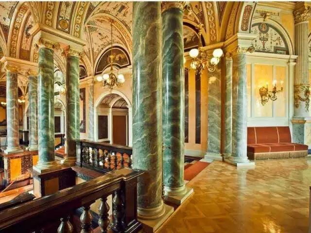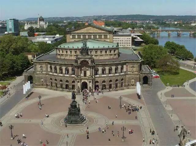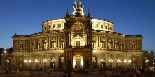 德雷斯顿森帕歌剧院 Semperoper(德国金色大厅)是茨温格宫广场上一粒璀璨的珍珠。1838 年由伟大的宫廷建筑师 Gottfried Semper 设计 (维也那金色大厅是他的姐妹作)。在剧院辉煌的墙面上雕塑着萨克森州徽“爱”与“公正”。在剧场进口处屹立着歌德和席勒的雕像,,索福克勒斯,莫里哀,席林等西方文化历史伟人像。