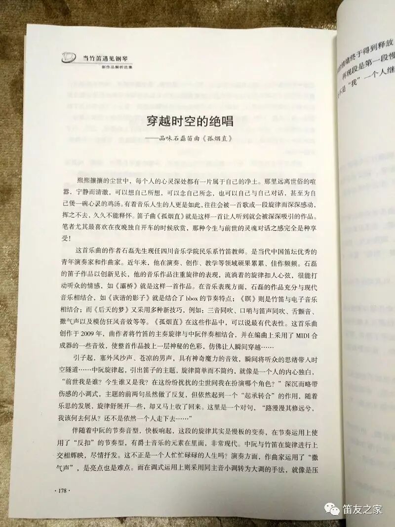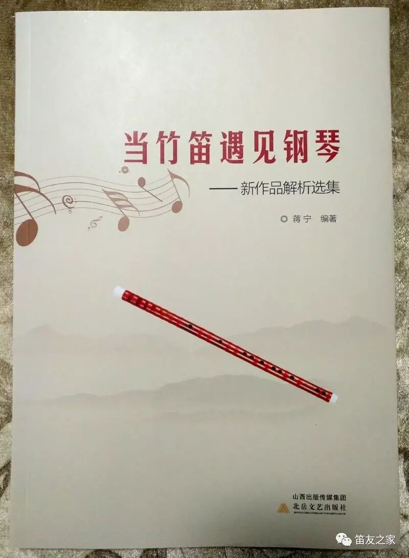 【笛友之家讯】:(记者 刘墨)由青年竹笛演奏家蒋宁编著,北岳文艺出版社出版的《当竹笛遇见钢琴——新作品解析选集》于近日正式出版上市。本书集结了近年来风靡笛坛的十几首竹笛独奏作品,并以钢伴总谱、旋律简谱、乐曲解析三个板块呈现,填补了之前竹笛类出版物的空白。相信本书的出版会为竹笛学习者、从业者和广大爱好者带来真正的帮助。