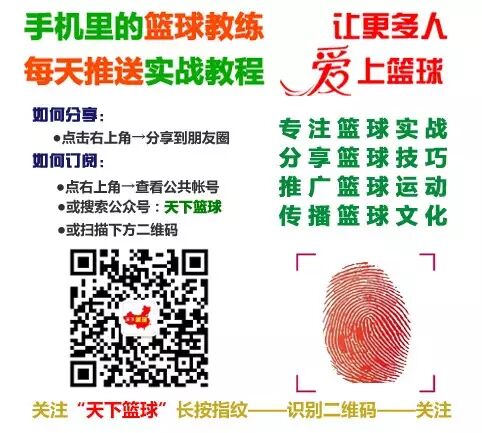 今天是周末,昨晚电脑出了些故障没有给大家及时推送教程,给兄弟们说声不好意思,连夜加班给大家整理了这份教程,没有时间练习的同学请先收藏起来,仔细观看每个动作的要领,慢慢练习,因为我们每个人的身体、技战术素质以及打球的风格和位置不同,我们的教程不可能面面俱到,如果兄弟们有什么意见和建议请在公众号上给我们留言,我会尽最大努力满足大家的要求。老规距,如果有收获记着把我们的教程转发给你身边的小伙伴,【天下篮球】的成长同样需要兄弟们无私的分享,感谢,让更多人爱上篮球,加油!