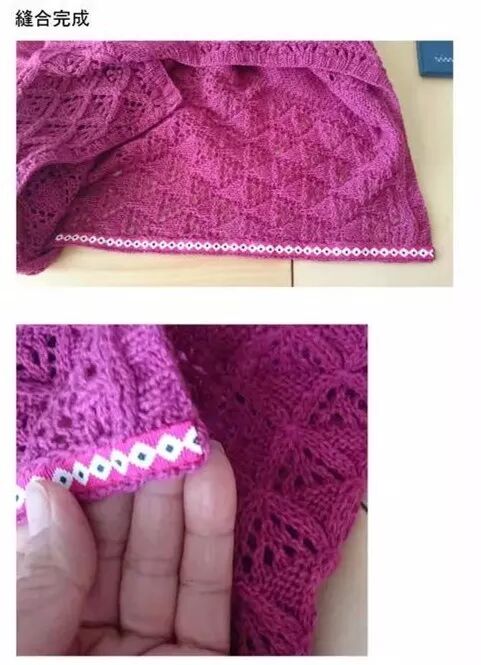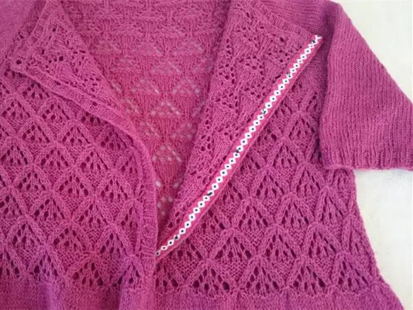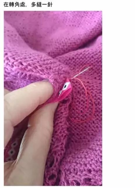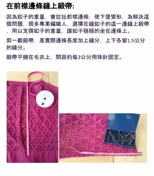 因为扣子的重量,会拉扯前襟边条,使其下坠变形,为解决这个问题,很多专业编织人选择在缝扣子的这一边缝上缎带,用以支撑扣子的重量,让扣子稳稳的坐在边条上。