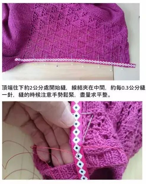 3、缝到尾端,折入预留的缝分,同时缝合毛衣边条和两层缎带