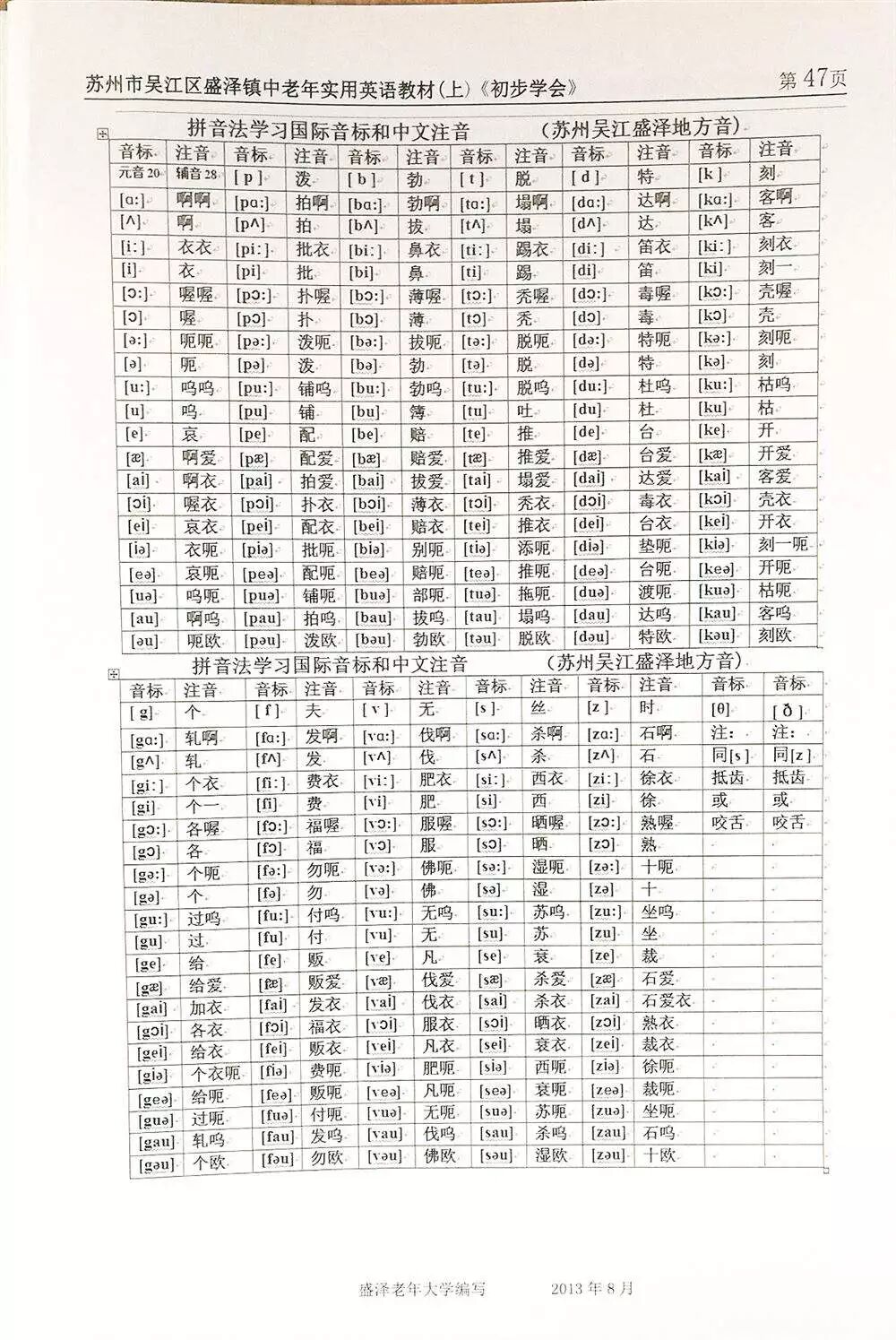 “那时候我脑子里每天都在想教材这件事情。”郑燮明说,结合几个月的教学实践,他花了一个星期编成了盛泽方言音标表。他还用盛泽方言一句一句地给句子注音,这样不懂拼音字母的老人也能通过盛泽话的发音来读英语了。