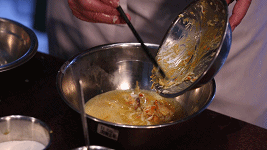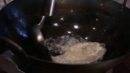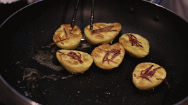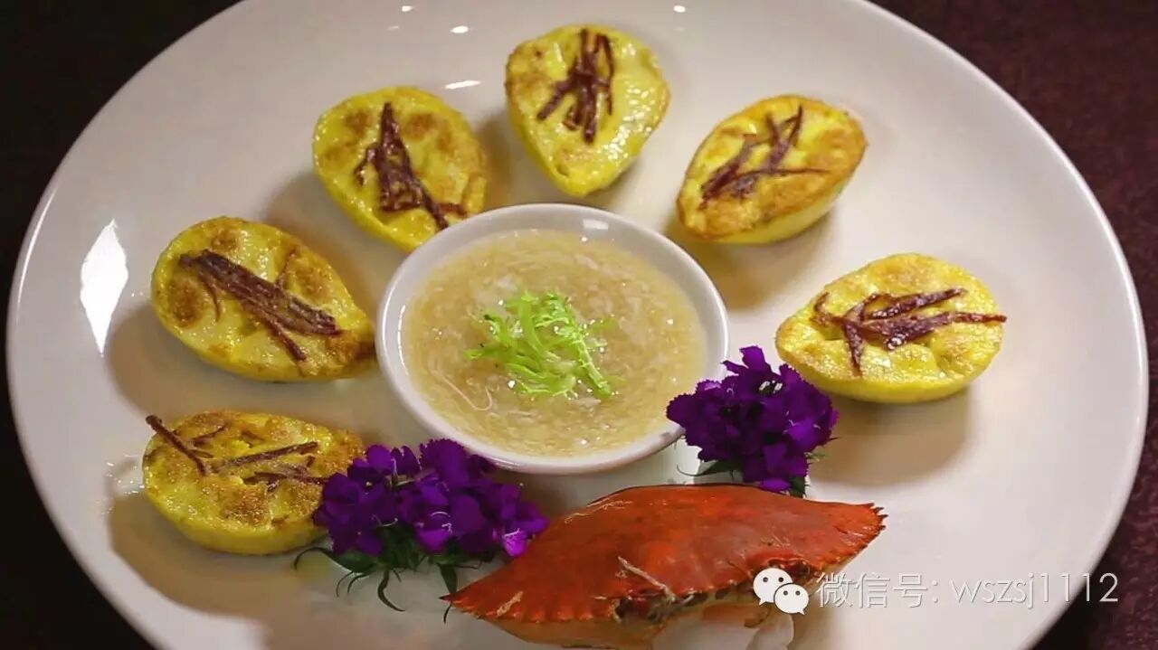 琵琶蟹熟了后将其取出,表面涂上蛋黄浆并铺上火腿丝。慢火将其煎至金黄!