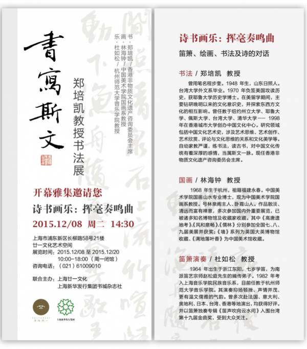 12月8日(周二)下午14点30分, 开幕雅集:将由香港非物质文化遗产咨询委员会主席郑培凯教授、中国美术学院国画系林海钟教授、杭州师范大学音乐学院杜如松教授,通过诗、书、画、乐等多种艺术形式的集中展示,带来一场大师云集的笛箫、绘画、书法及诗的对话。