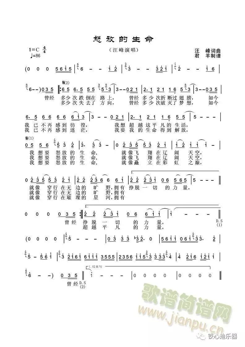 当耳边响起那激动人心的弦律,王峰那《怒放的生命》,我都会情不自禁的跟着唱起来,“我想要怒放的生命,就像飞翔在辽阔天空,就想穿行在那无边的旷野,拥有挣脱一切的力量……”铿锵有力的旋律颤动心扉,这律动的天籁奏响了生命的节拍。激昂的乐曲使人心潮澎湃,扣人心的,是令人听之动容的旋律,更是蕴含其中的生命的内涵。鹰击长空,鱼翔潭底,虎啸深山,驼走大漠。所有的万物都在怒放着自己的生命。生命是短暂的,如果不怒放就对不起生命本身。生命是珍贵的,如果不怒放就感受不到生命真正的美妙与精彩。我们唯有怒放生命,珍爱生命,才能真正拥有生命,享受生命。曲谱与伴奏在最下面共享