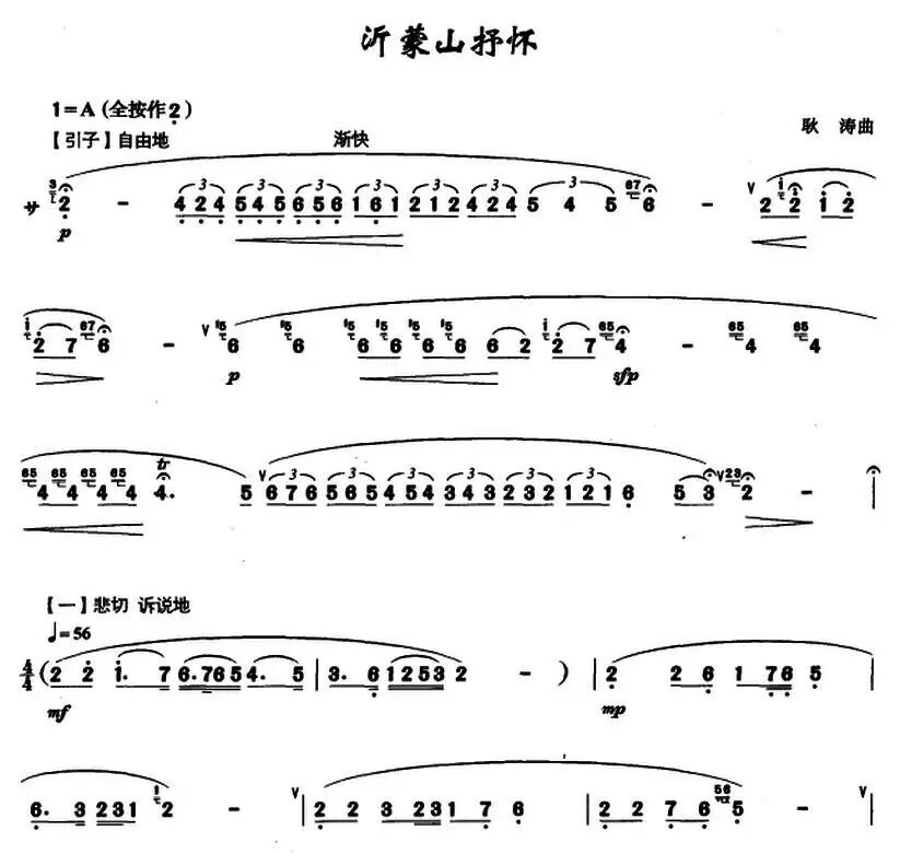《欢乐的校园》创作于1989年,使用G调梆笛全按作1演奏,乐曲旋律欢快活泼,刻画了校园学子们充满朝气、积极向上的精神面貌,展示了一幅生动校园生活画面。《沂蒙情》创作于1999年,使用G调梆笛全按作2,乐曲旋律温馨甜美,亲切质朴,是作者对美丽家乡的热情讴歌。《边防骑兵》创作于2000年,使用E调笛采用三种不同指法演奏,曲中表现了边防骑兵威武雄壮的勇敢形象和精神面貌,乐曲激昂奋进,运用半音阶的快速吐音,以及多次转调,使得情绪得到不断提升。《沂蒙山抒怀》创作于1988年,是耿涛的最为经典的代表作,乐曲以悲切的音调,诉说了山东沂蒙山地区人民过去所经历的苦难;赞颂了今日沂蒙山区出现的欢天喜地的变化和人们美好、幸福的生活。此曲在业内流传较为广泛,笔者曾写过一篇《一曲沂蒙悠悠情——笛曲<沂蒙山抒怀>的艺术创作》(载于《乐器》2013年05期),对其艺术特色进行专门分析。