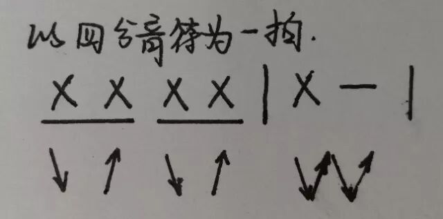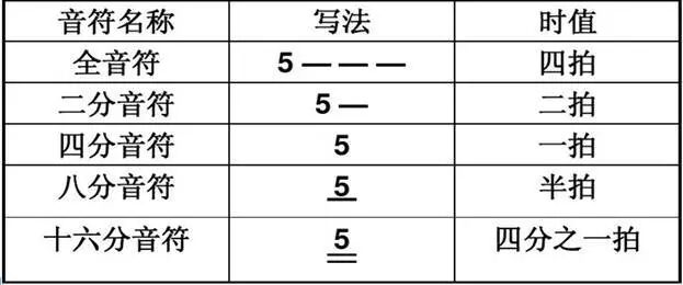 全音符形如X - - -,二分音符形如X- -,四分音符形如X,八分音符形如X下面加一条横线,十六分就是加两条,
