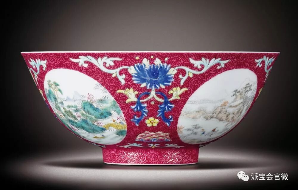 清道光 胭脂红地轧道粉彩开光山水纹碗