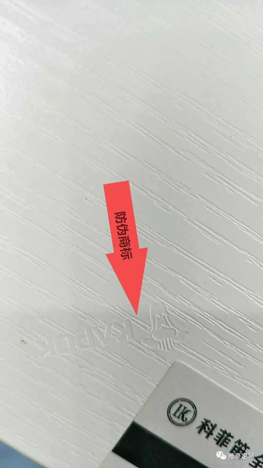 “科菲笛”品牌所使用的板材是广东省名牌产品"红棉花",雅豪定制店出的产品所使用的全部都是红棉花实木多层板,具有检测证书,无论是封顶板还是无关紧要的地方所使用的板材全部都是红棉花实木多层板,绝对没有掺杂其他品牌或者其他类型的板材。“红棉花”每块板材上都有它的防伪标识,绝对仿冒不了!