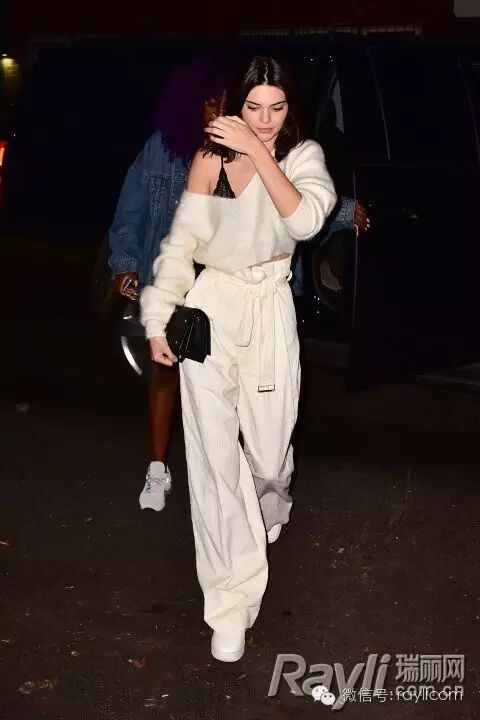 Kendall Jenner 用吊带背心叠搭宽松针织衫,露出一侧香肩和吊带,蕾丝与针织的碰撞更性感。