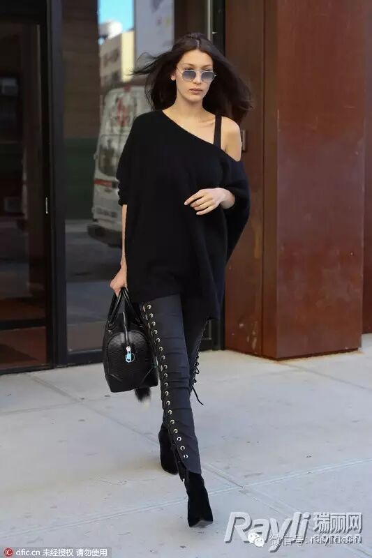 贝拉-哈迪德黑色露肩上衣性感诱人 Givenchy手袋+Stuart Weitzman高跟鞋,气场全开。