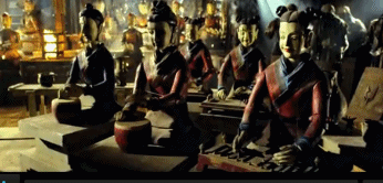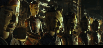 当然,最华彩的,是陪赞墓迎宾殿的这段机关木俑戏,扛起了整部片的“悬疑”重任。