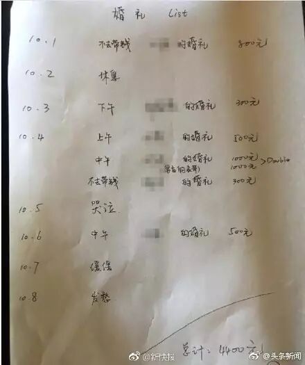 10月1日、3日、4日、6日,4天!一共要参加6场婚礼!光份子钱就要花费4400元,一个月不吃不喝工资都还不够!