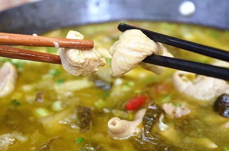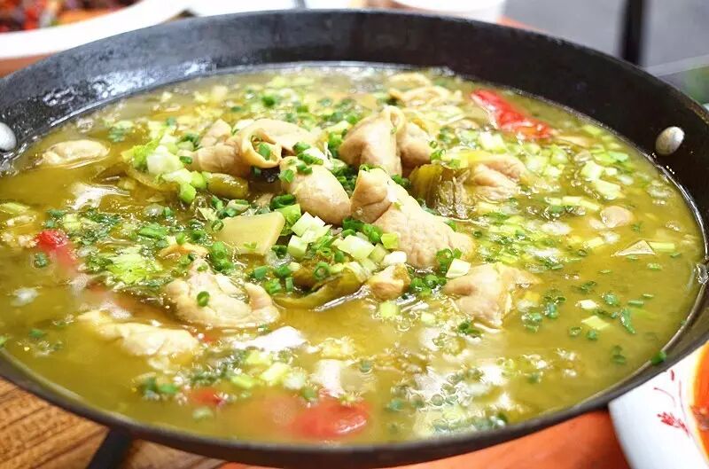 一锅翠绿的酸汤肥肠鸡都要闷出来了!被黑色的铁锅装起向你表达出请大口吃肉的态度。除了酸汤口味,还有传统的红汤口味。