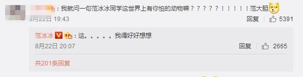 网友看到此番此景,隔空喊话道:“我就问一句范冰冰同学这世界上有你怕的动物嘛??!范大胆”而范冰冰认真地回答道:“这。。。。。我得好好想想”过路的看官们连连捧腹大笑。
