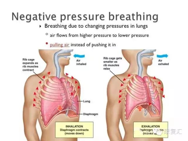 这两个过程中,吸气是主动过程,吸气时,腹壁的前凸表明腹部肌群处于舒张状态,就像一块被拉长的橡胶,具有弹性回缩力,随时准备回复原状。当膈肌舒张时,腹壁的弹性回缩力使腹部脏器和膈肌恢复到初始位置,此时肋间外肌舒张,肋骨和胸骨下降,胸腔容积减少,呼气运动开始。也就是说,吸气肌群的舒张和胸腹壁的弹性回缩力对于平静呼吸已经够了。