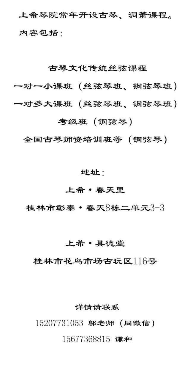 ——张子盛古琴艺术中心桂林分馆。中国古琴学会理事。 自2008年古琴教学至今,我们的教学团队一直致力于古琴的学习与交流。2013年以专业的教学团队成为“张子盛古琴艺术中心”桂林分馆,并以更系统的教学理论为基础为广大古琴爱好者提供优质的古琴教学。