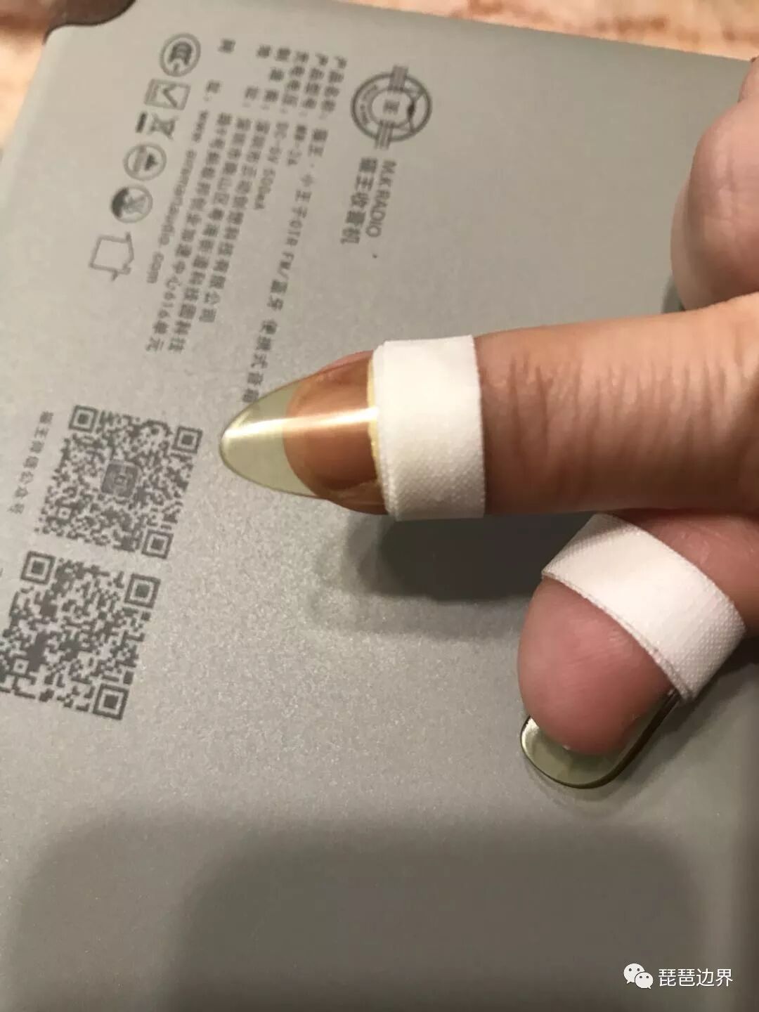 2 义甲突出指尖多长?这是个见仁见智的问题,每个人的手指长短、大小、粗细不一样,不能一概而论。只能参考!我见张强教授之前一直都把义甲突出指尖三四毫米左右,见到他带的情况:突出近八九毫米。他说:『这样声音传输速度快』哇!整整十年时间在网上写的文章也是写突出3至4毫米。对不起,误导大家了。道歉道歉!我仔细地观察过张老师的手型,不属于纤细型。古筝演奏家王中山老师也是胖短型的手,我也是这样的手。那么我在思索:『是否因个人条件取长补短呢?』实践出真知,我实验后答案是:yes ! 正确,是这样的!声音传输快。反之,如果手型纤长的是否可以包短一点?这问题我要请教赵聪老师与吴玉霞老师,我观察过她们的手指都属于纤细修长的玉指。留意这篇文章的留言部分将会有答案。。。。。。。