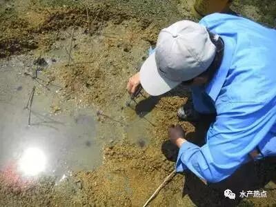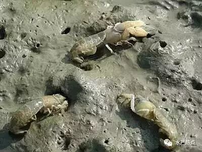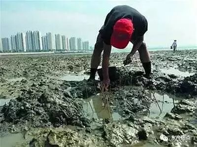 首先,用铁锨铲掉滩涂表层的黑泥,下面会露出密密麻麻的孔洞,这些孔洞大约有大拇指粗细,孔洞中是清澈的海水,这个小孔就是虾虎窝。