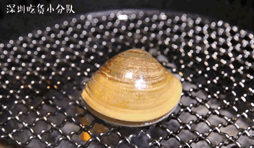 大蛤在铁网上烧熟后慢慢打开,很可爱。