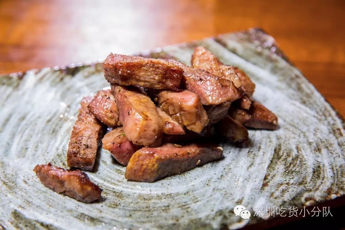 烤好的整片牛排剪成条,让四周都在炭火上稍微炙烤下。撒上玫瑰盐调味,或者蘸着柚子醋吃,比其他部位的肉有嚼劲。