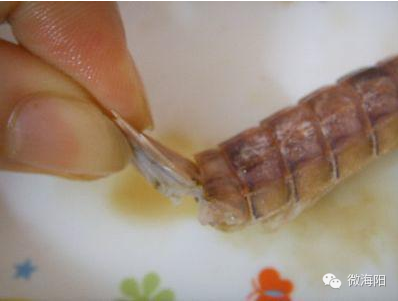 1.把尾部最外面两个小脚拧断,然后捏着尾部轻轻往上一折,再拧掉。