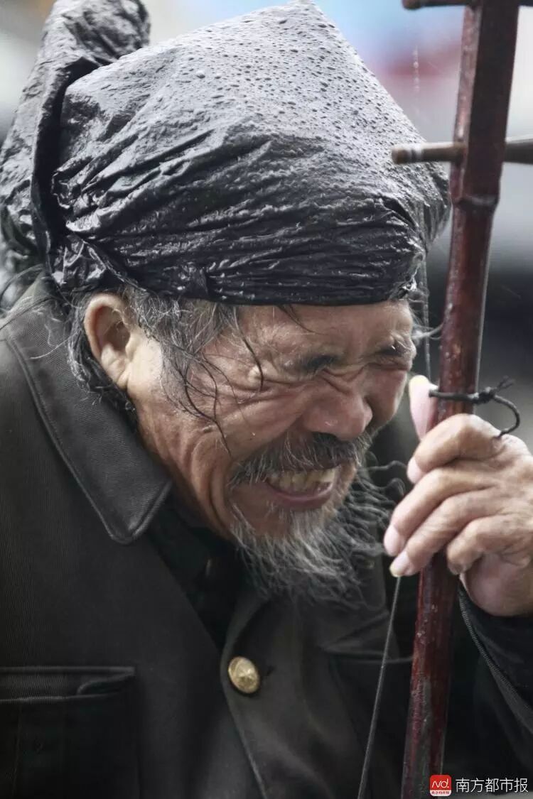 昨日深圳,一名老人不惧风雨,依旧深圳街头弹奏二胡。