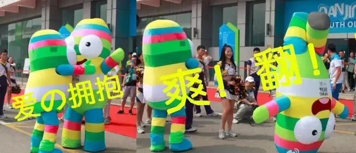 就这样,2014年青奥会短短的十几天内,砳砳从一只丑哭的五彩腰子华丽转变为“史上最呆萌的吉祥物”、“青奥会摔跤项目世界记录保持者”、“花样摔跤冠军”...赢得了大家满满的喜爱。二胡卵子的这场逆袭之路,走得潇洒漂亮,也最终在闭幕式上顺理成章地“上了天”!