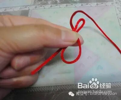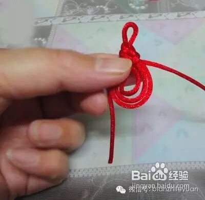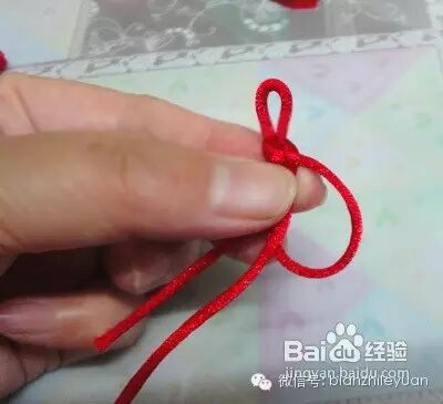 我们用右边的绳逆时针从红绳的上面绕到后面,此时下面也形成了一根圈圈