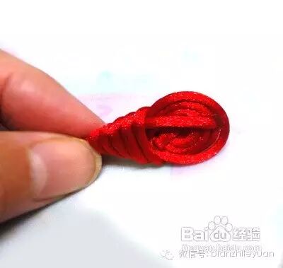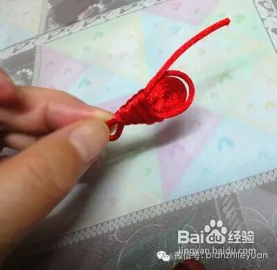 琵琶结盘扣因其形似琵琶而得名。我们取一根40厘米红绳,在一头留出大约10厘米的地方对折,分为左右两根绳