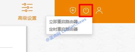 2、点击管理界面右上角的电源开关按钮选择定时重启路由器,大概位置和样子如下图: