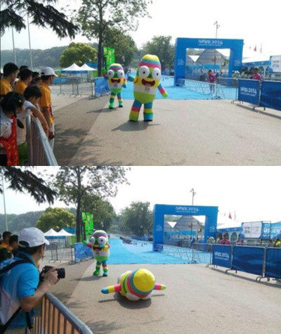 后面那个吉祥物应该是正在思考该怎么处理这种突发情况,经过激烈的心理斗争后,他决定……假装四处看风景~