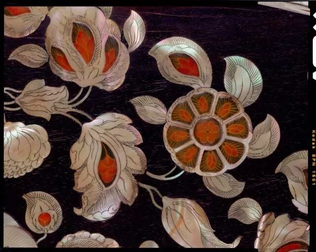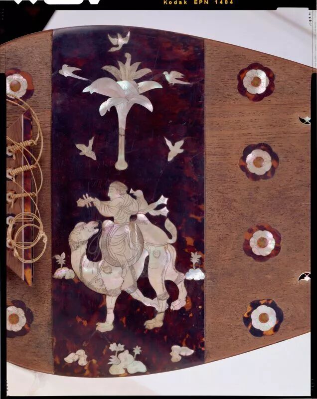 螺钿紫檀五弦琵琶 局部,骆驼和旅人的图样具有明显的西域风情