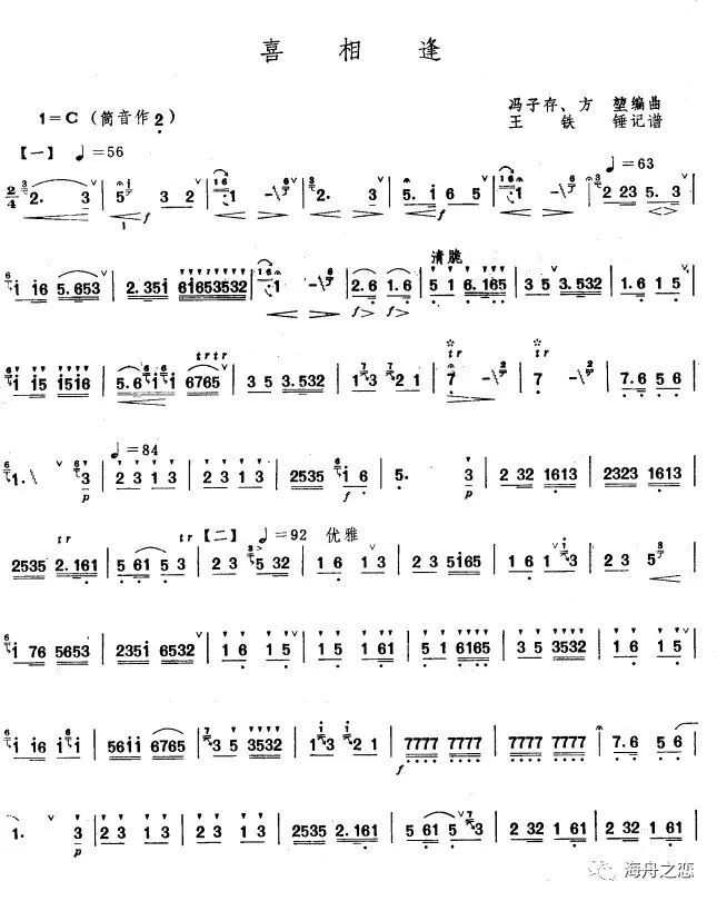 【笛子十大名曲】《喜相逢》是冯子存于20世纪50年代创作的一首笛子独奏曲,乐曲的结构为民间器乐曲中常见的变奏曲式。其原曲为内蒙古一首民间乐曲,后来流传到张家口一带,成为河北梆子和二人台等地方戏曲的过场音乐,常用于戏中角色入洞房、拂拭灰尘等动作的伴奏。经冯子存改编为笛子独奏曲,乐曲的结构为民间器乐曲中常见的变奏曲式,表现一对情人惜别和重逢时的心情。