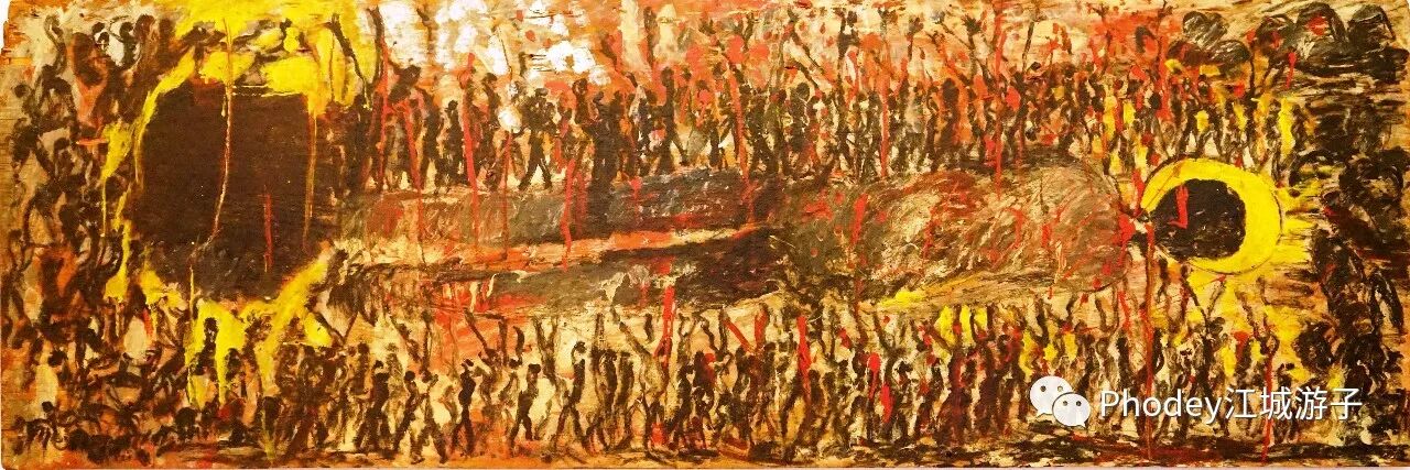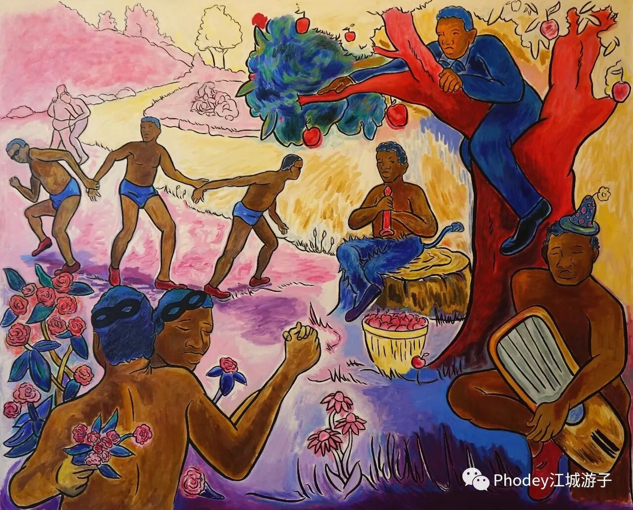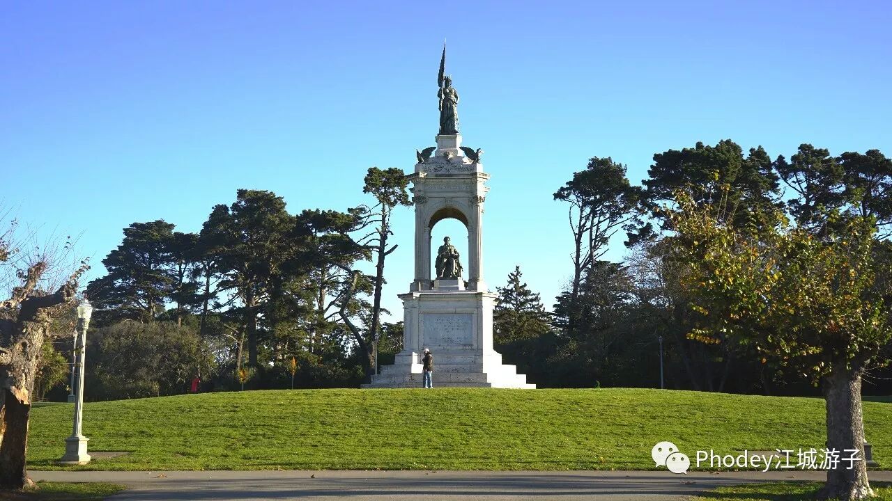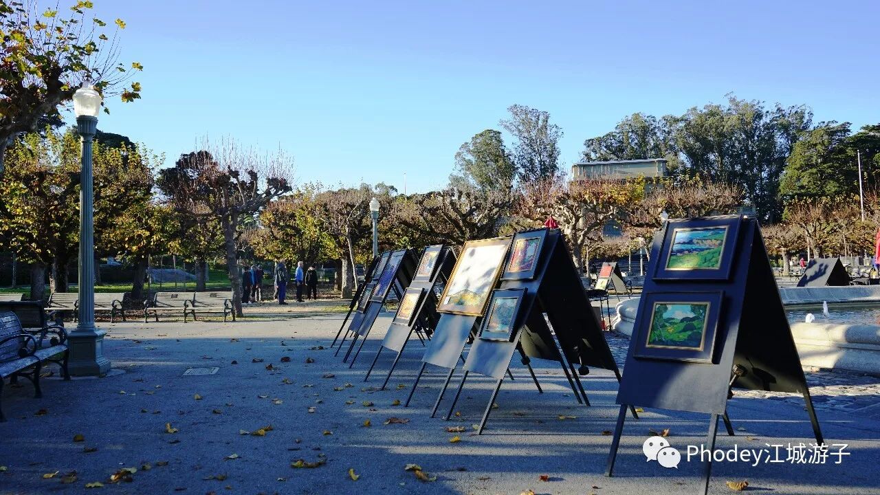 金门公园喷泉周边的绿茵上,人们练着太极,大陆华人、香港华人和白人各为一派。商贩不紧不慢地展开画架,摆放着出售的作品。
