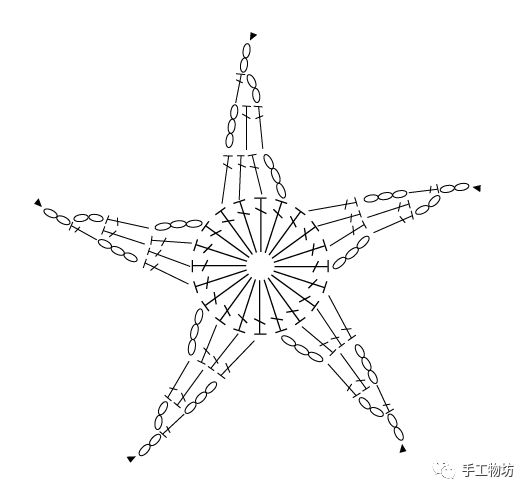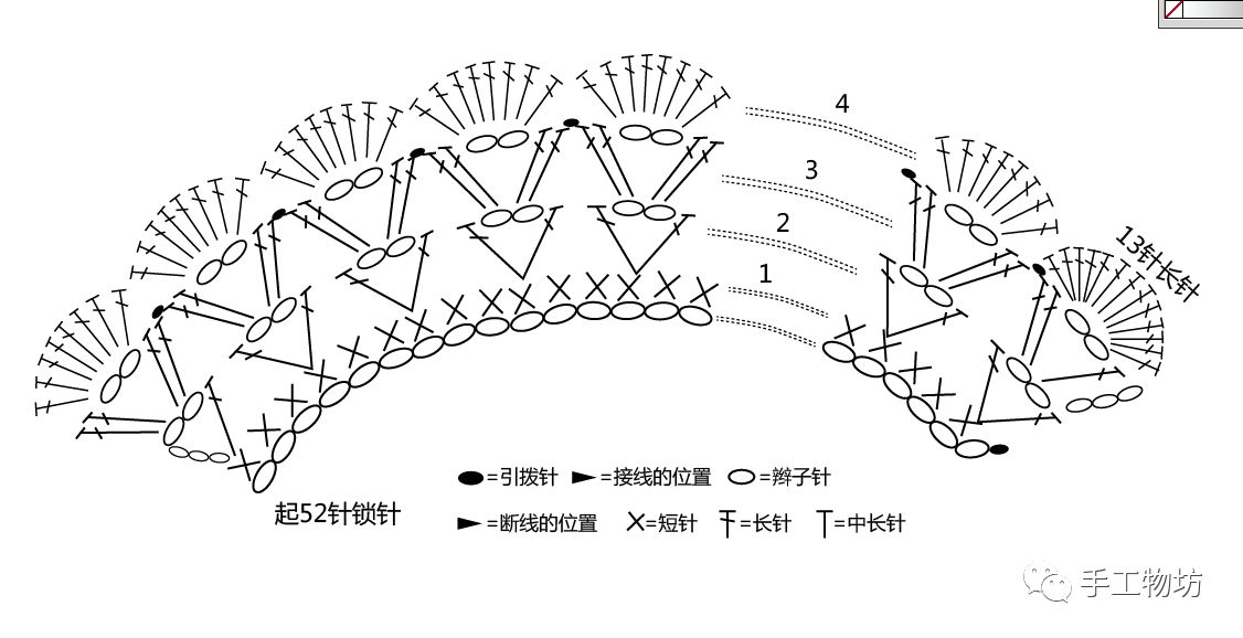 立针4锁针后在同1锁针里再钩1针长长针,中间隔1针重复钩