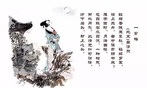 红藕香残玉簟秋,轻解罗裳,独上兰舟。云中谁寄锦书来,雁字回时,月满西楼。
