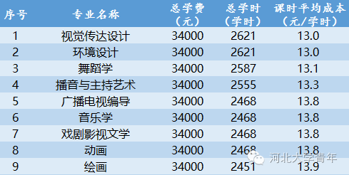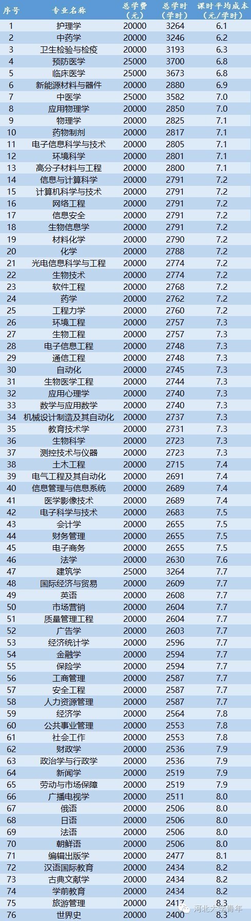 注:总学费(学时)是四年总学费(学时),其中预防医学、临床医学、中医学、建筑学为五年总学费(学时)。数据来源河北大学教务处14级人才培养方案。