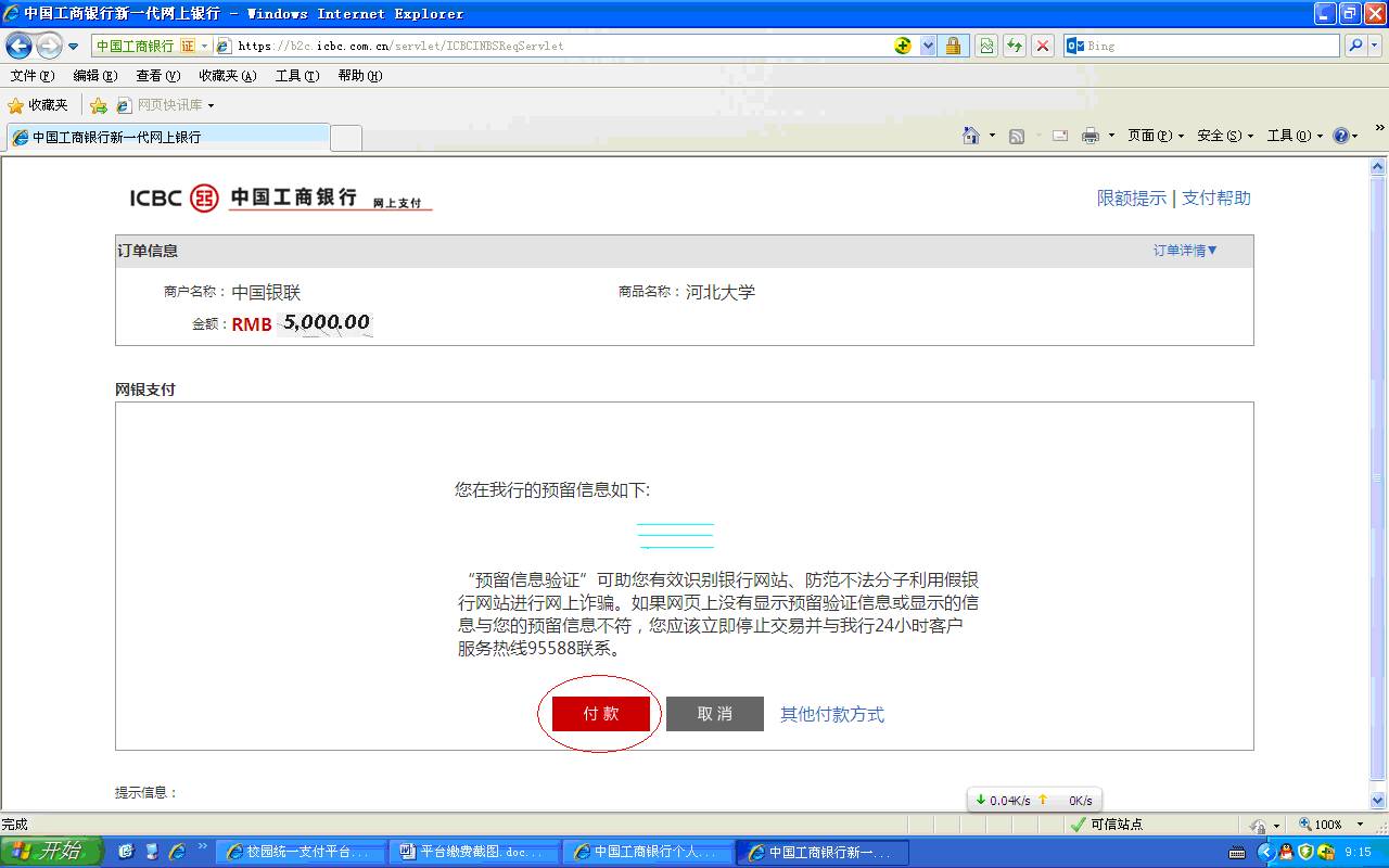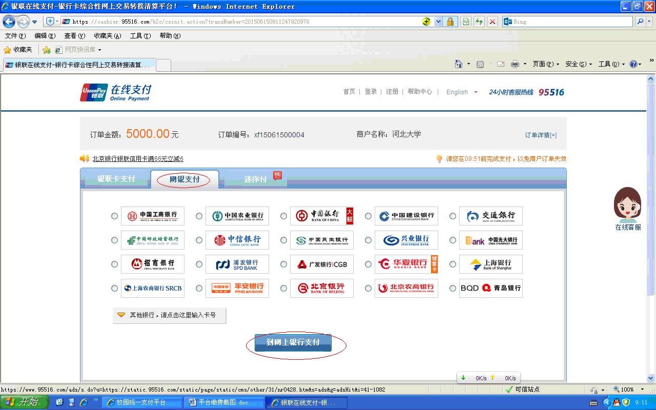 12、如需使用网上银行进行支付,进入支付界面后选择“网银支付”,选择相应银行,点击“到网上银行支付”(以下操作演示以工商银行为例)。