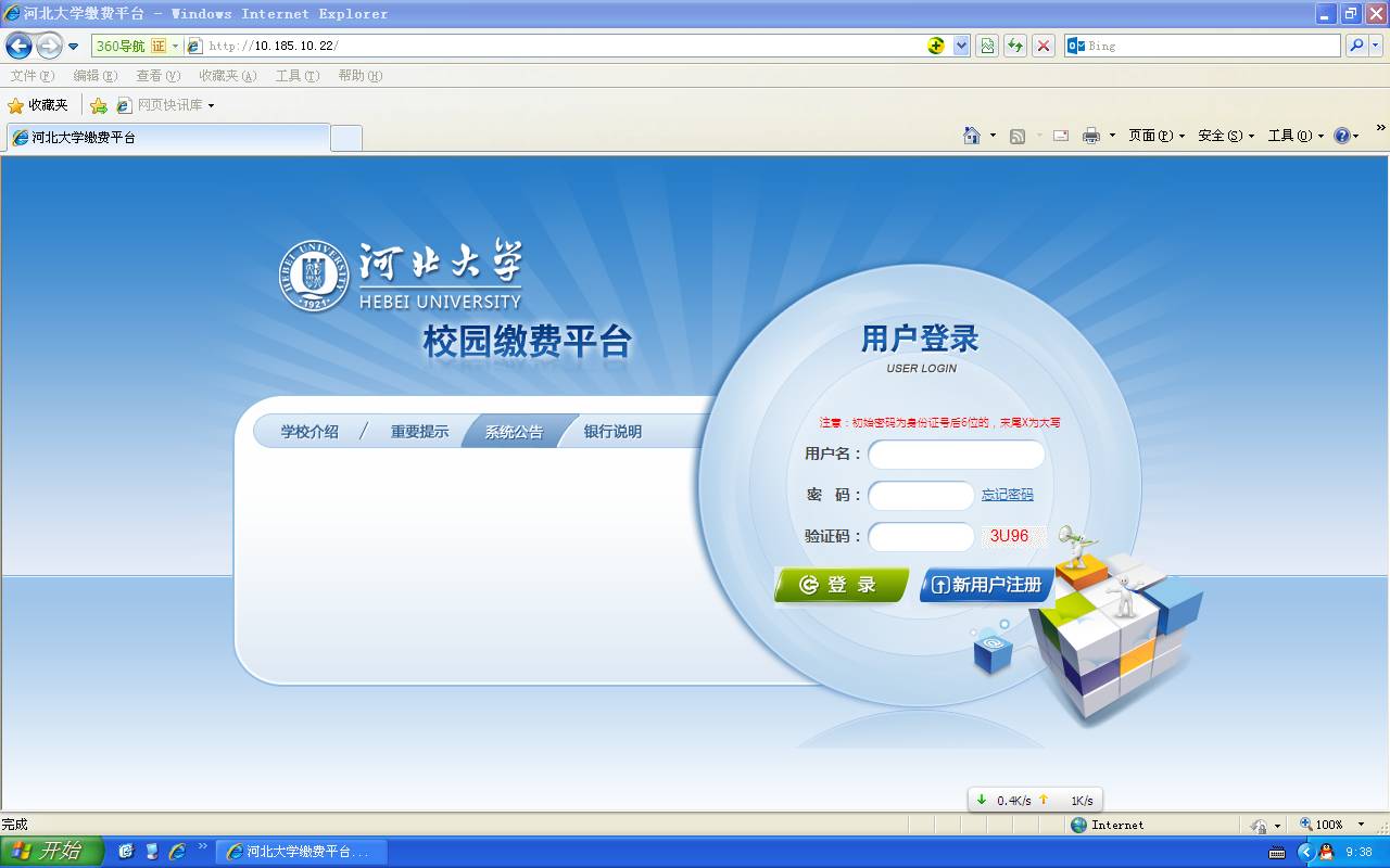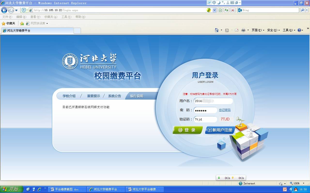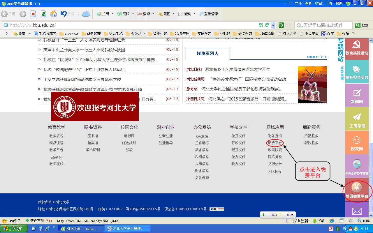 1、登陆河北大学主页(http://www.hbu.edu.cn/),点击右下方“网络应用—-缴费平台”或“专题网站--校园缴费平台”,进入“河北大学校园缴费平台”。
