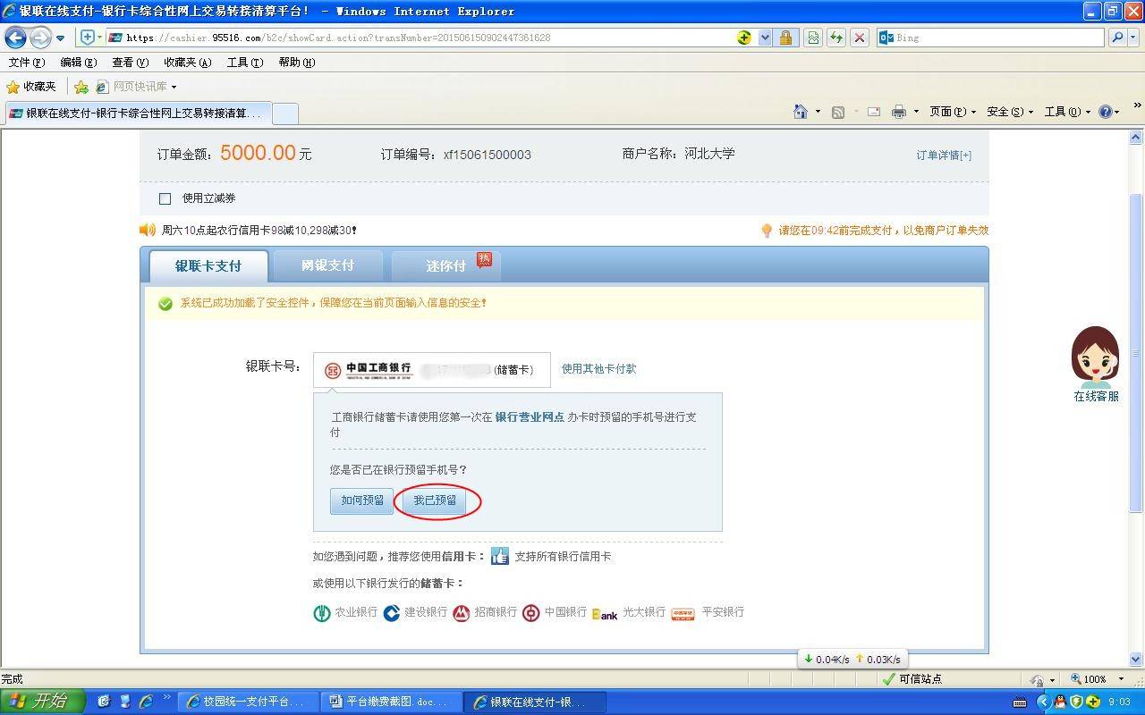 9、使用银联在线支付需填写在银行营业网点办理银联卡时预留的手机号码,以便接收短信验证码。如确认预留手机号码无误,点击“我已预留”。